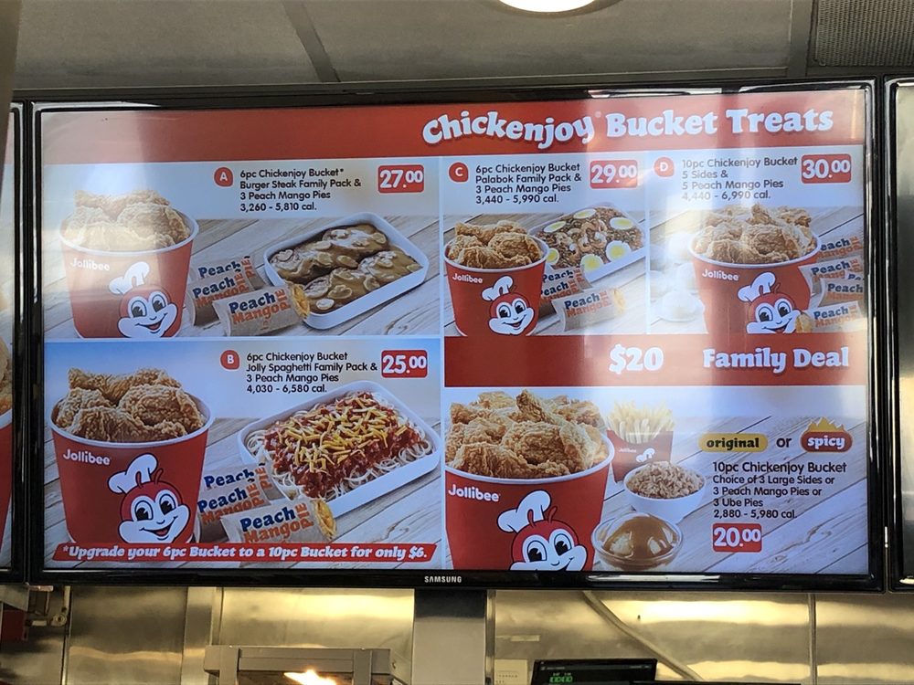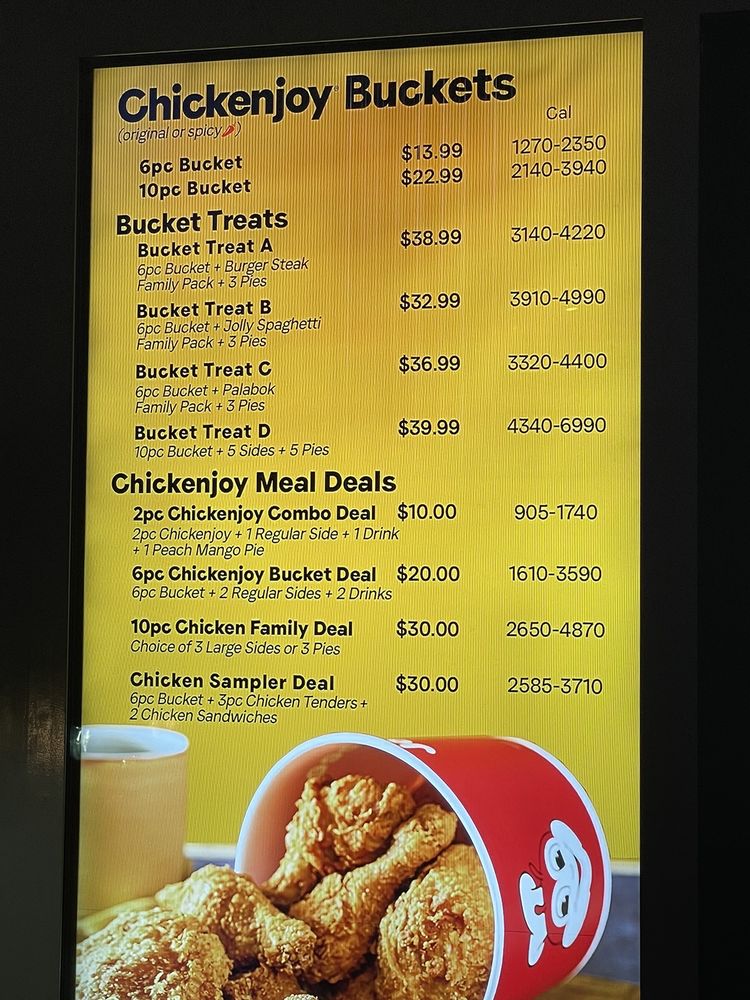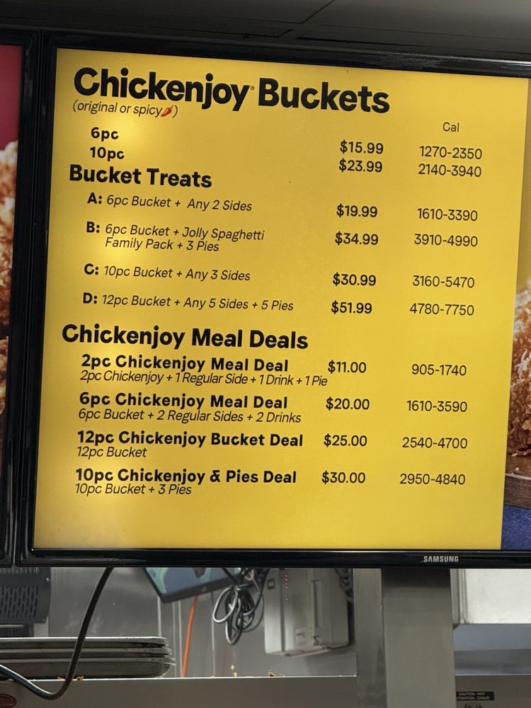 6pc of our next-level crispy, next-level juicy Chickenjoy fried chicken (3 legs, 3 thighs, Choose between Original or Spicy) served with a Palabok Fiesta Family Pack and 3 pies. Note: Palabok sauce contains pork that cannot be removed.